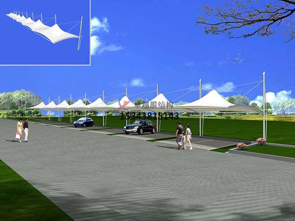 膜结构雨棚是一种全新的建筑结构形式,它集建筑学、结构力学、精细化工与材料科学、计算机技术等为一体,具有很高技术含量。其曲面可以随着建筑师的设计需要任意变化,结合整体环境,建造出标志性的形象工程。