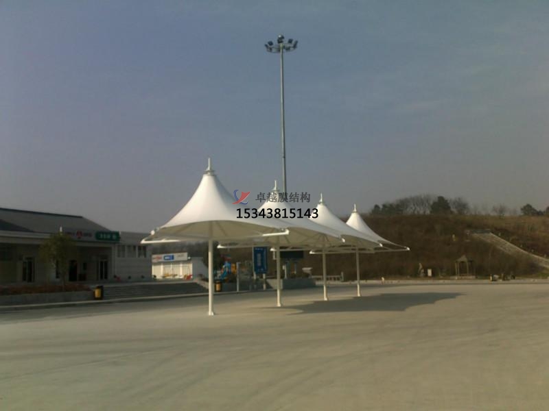 结构连接配件:所有膜结构配件全部采用镀锌材料,所用螺栓全部镀锌高强螺丝,所有连接部件全都用铝型材做压板。所有帽顶封膜部分全部采用上海陶氏生产高强度耐候胶,严苛的选材铸就一流品质。