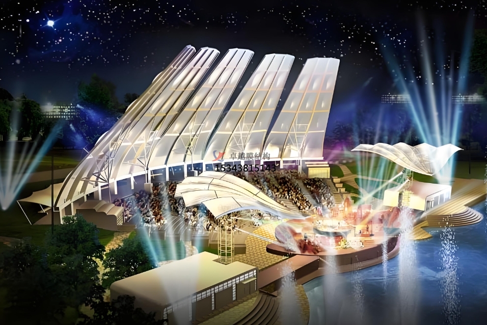舞台膜结构,简而言之,是采用高强度柔性薄膜材料(如PVDF、ETFE等)作为覆盖物,通过钢结构或索膜结构体系支撑,形成具有特定形态和功能的舞台空间结构。这种结构不仅外观新颖独特,能够根据设计需求自由变换形态,还具备良好的透光性、自洁性和耐候性,为舞台表演提供了无限可能。
