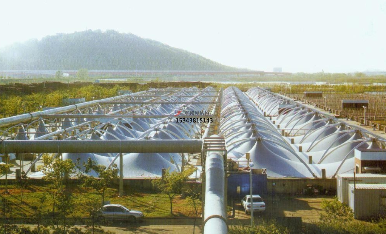 污水池反吊膜,顾名思义,是一种将薄膜材料以反吊的方式覆盖在污水池上方的结构。这种结构通过钢架或索网等支撑体系,将膜材料紧绷并固定于污水池上方,形成一个密闭或半密闭的空间,有效隔绝污水池内的恶臭气体和有害物质,防止其对外扩散,同时保护膜材料免受污水池内腐蚀性气体的侵蚀。